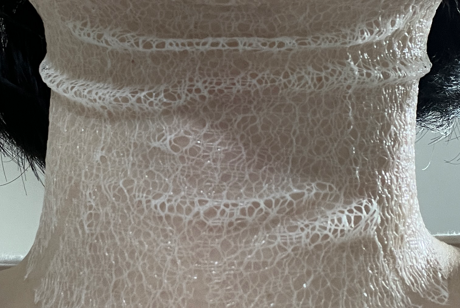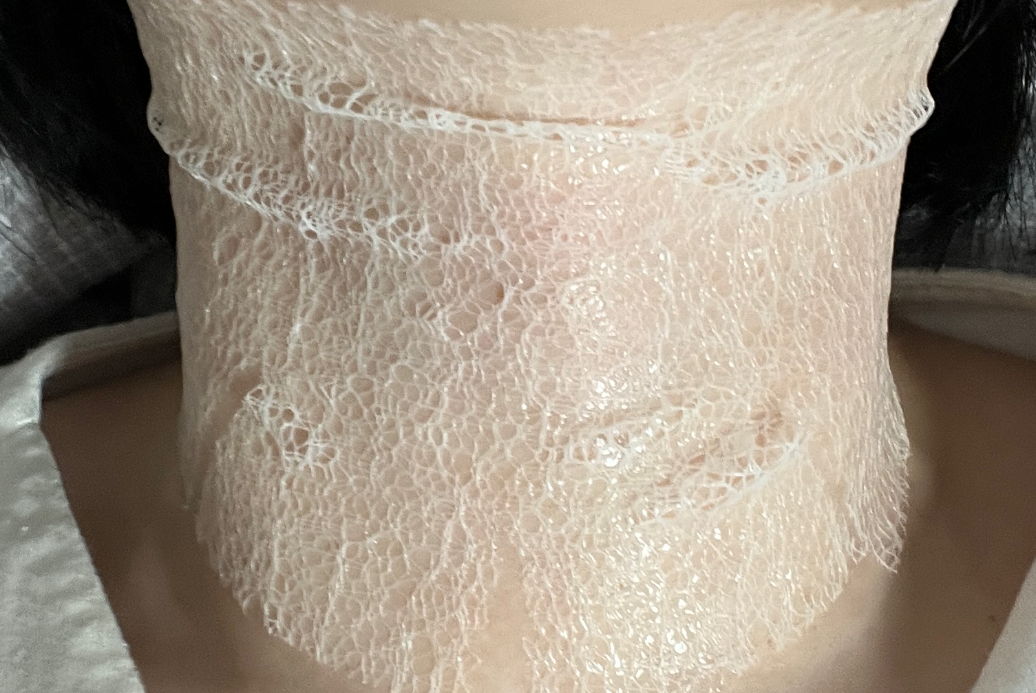 목 전체를 감싸주는 디자인이라 좋았지만 저는 목이 짧은 편이라 그런지 마스크가 저에게는 조금 크고 길어서 밀착력이 떨어지는 경우가 있었습니다. 붙였을 때 살짝 울룩불룩하게 뜨는 부분이 있어, 사용하는 동안 누워있는 것이 더 효과적이었어요. - 끈적이는 마무리감