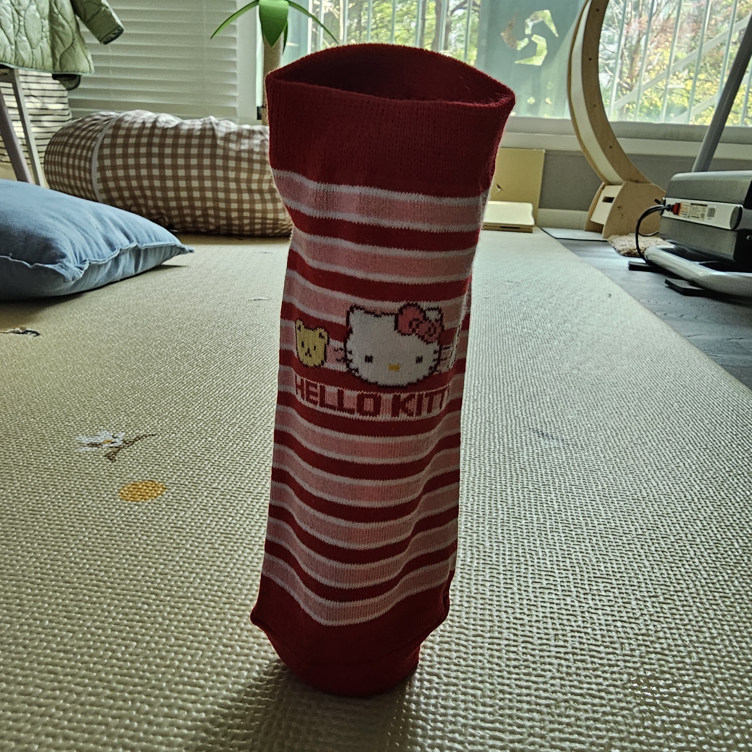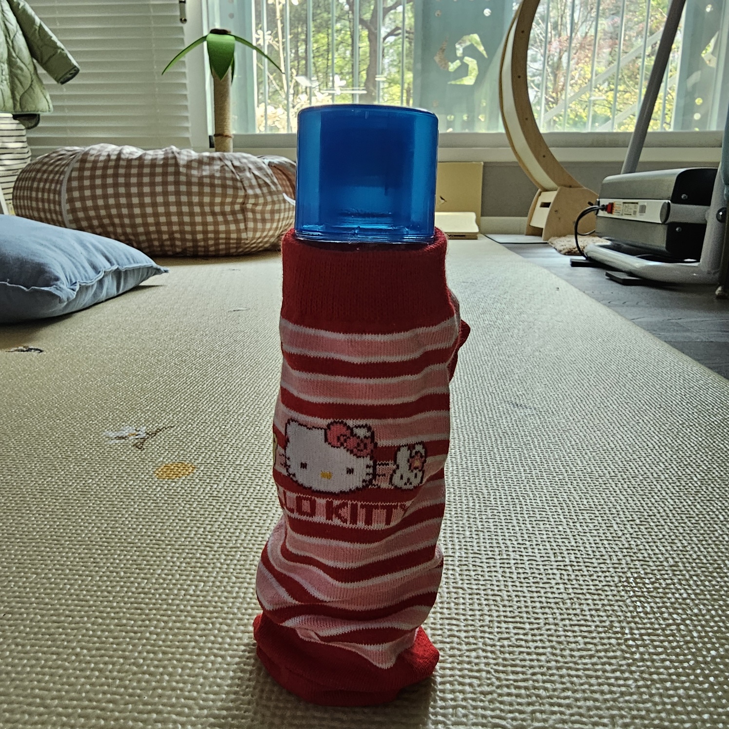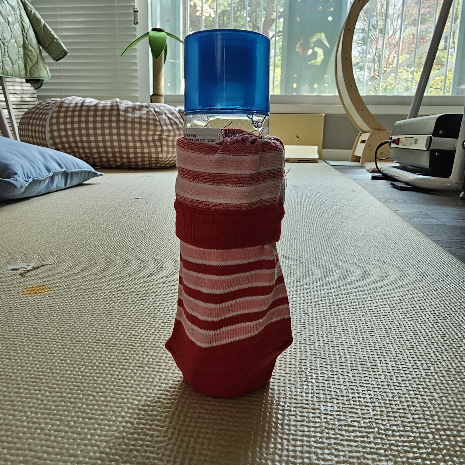 일단 양말을 바이오더마 아토덤 오일에 신겨줘요. 그리고 뚜껑 아래쪽으로 고무줄을 끼워주고 양말 윗부분을 접어줍니다.