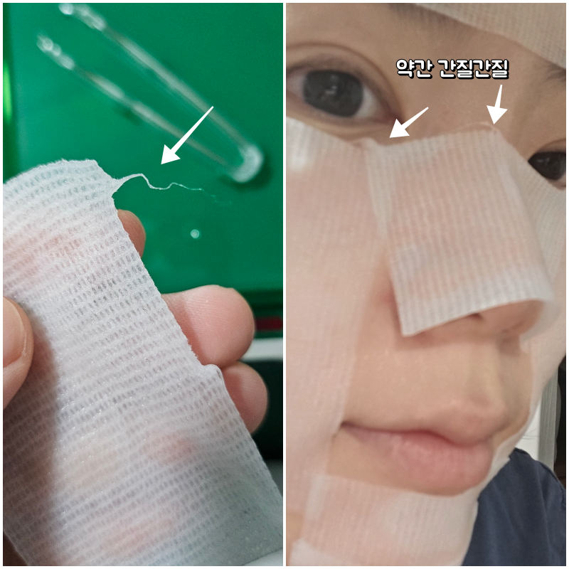 절취선이 있어서 정확히 반으로 잘라서 사용할 수 있다는 장점이 있었지만 한편으로는 아쉬운 점이 있었어요. 떼어내는 부위 그러니까 절취선이 있는부위가 반으로 자르고나면 면이 살짝 일어나서 그부분이 피부에 닿으면 간질간질 하더라구요. 그게 조금 아쉬웠어요.