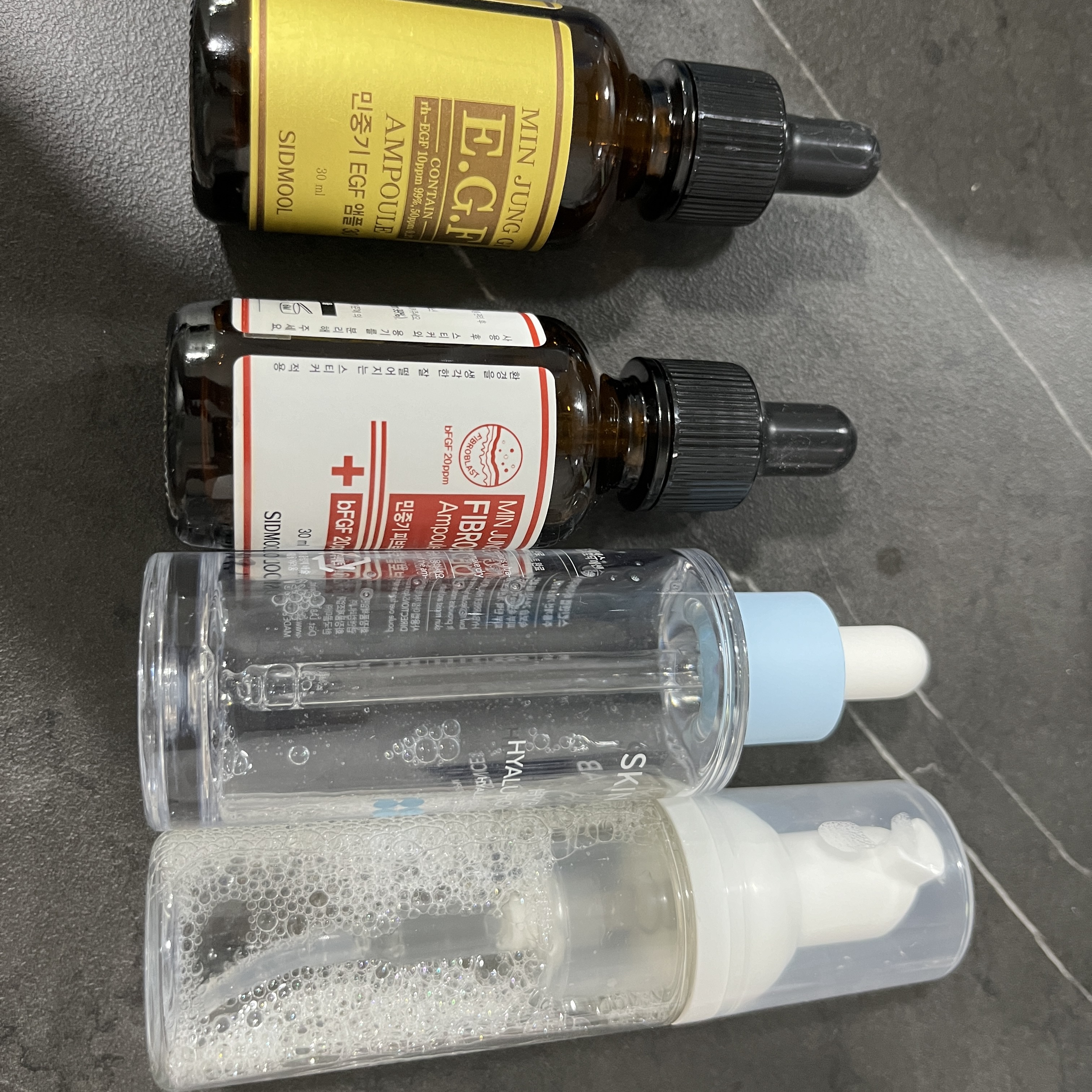 시드물 egf 앰플과 피브로블라스트 앰플은 정말 오랫동안 써오고 있는 제품이고, 스킨앤랩 하이베리어 히알루로닉 에센스도 작년부터 3통넘게 사용해오고 있는 제품이에요. 이 3가지 앰플, 에센스를 흔들어봤더니 거품이 막 올라오길래 egf : 피브로블라스트 : 하이베리어에센스 = 2:2:1 비율로 넣어서 만들어보았어요.