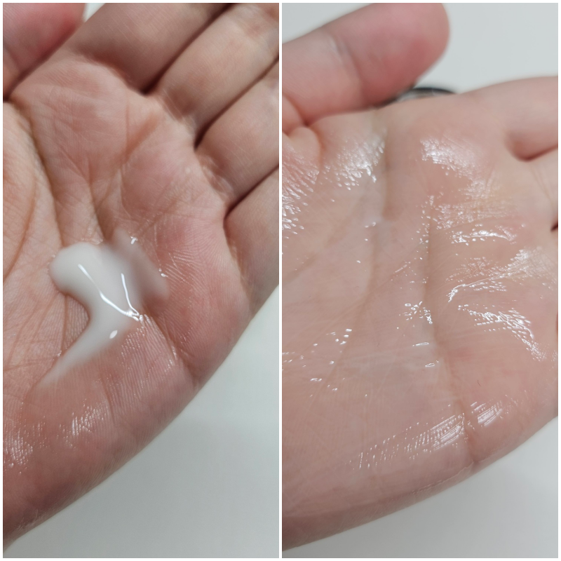 하이드롤라이즈드쌀단백질이 첫번째 성분이고 두번째 들어가는성분이 사이클로펜타실록세인으로 실리콘 성분이라 이러한 독특한 제형을 구현해내는 것 같았어요.